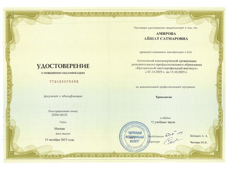 2019 г. – Центральный многопрофильный институт, профессиональная переподготовка по специальности «Косметология»