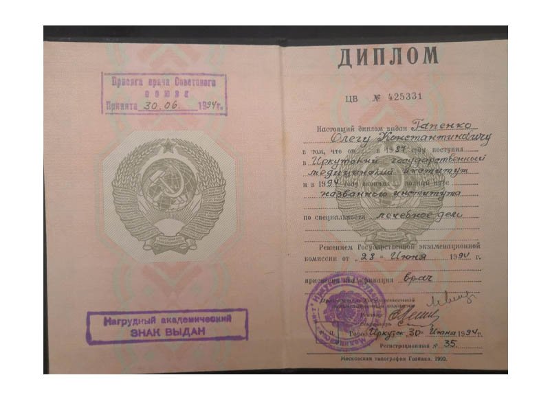 1994 г. - Иркутский медицинский институт, "Лечебное дело"