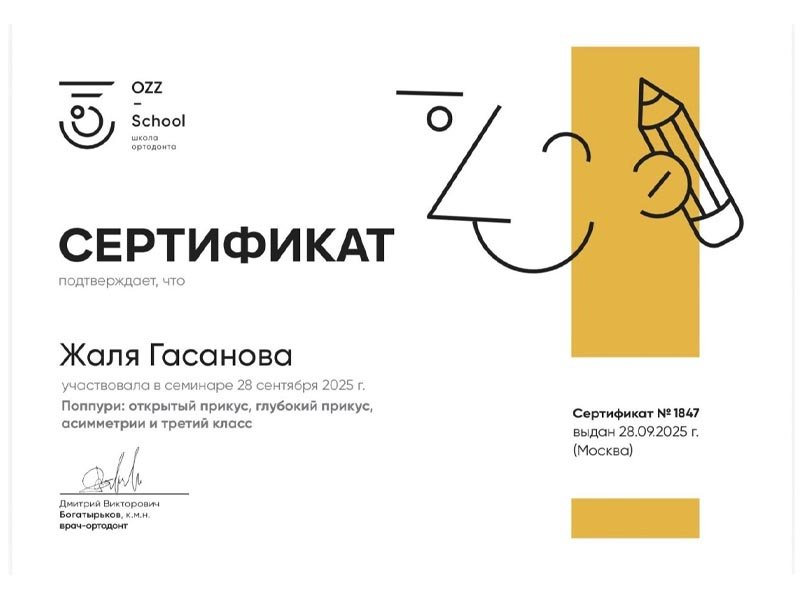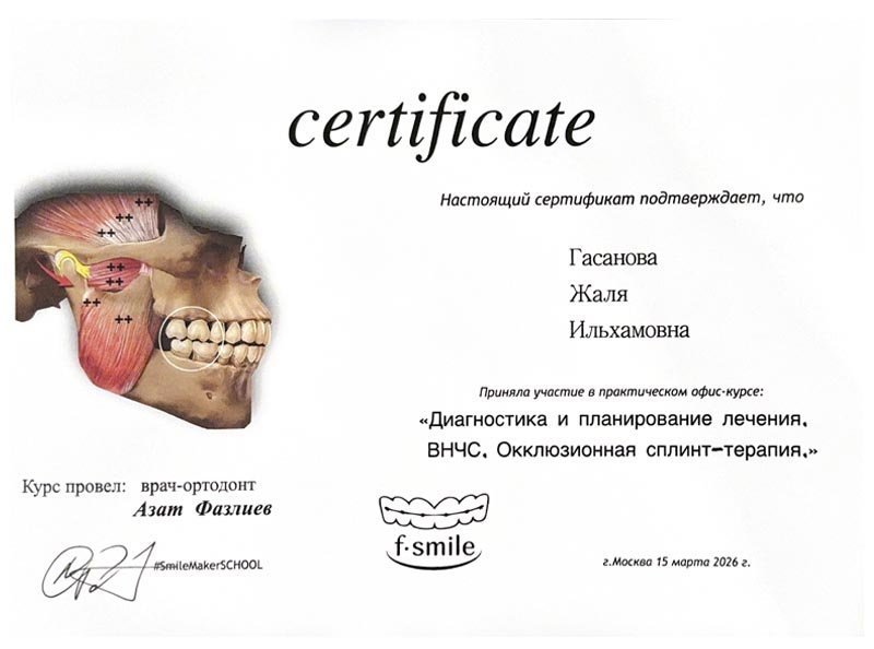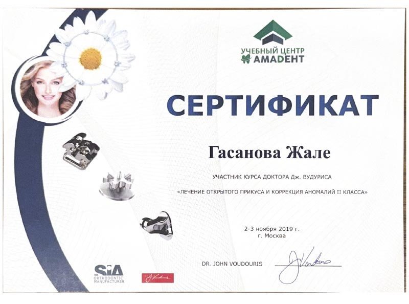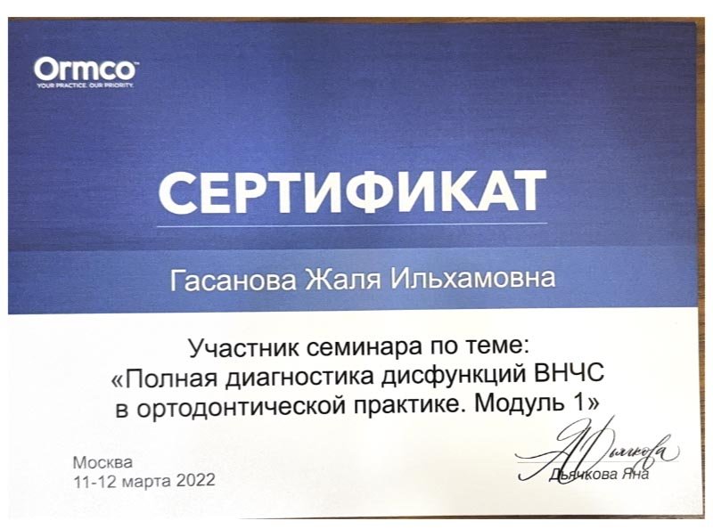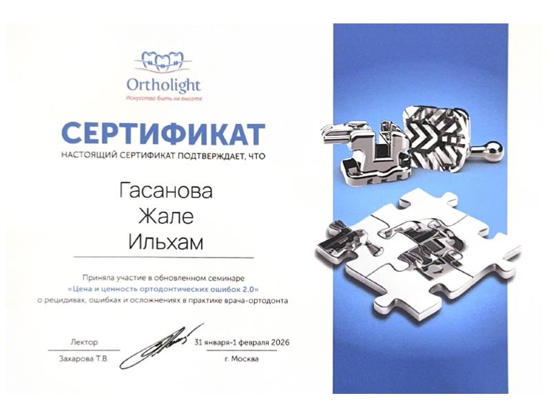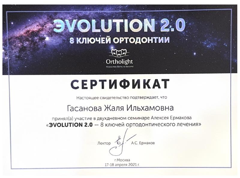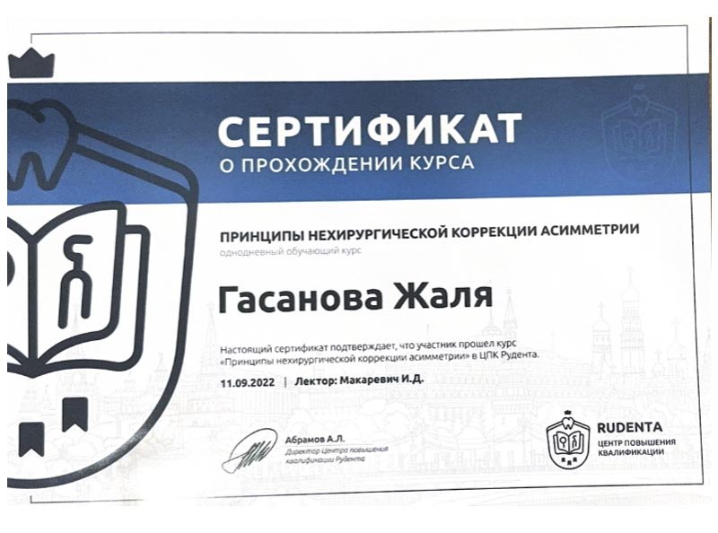2021 г. – Московский государственный медико-стоматологический университет им. А.И.Евдокимова, первичная специализированная аккредитация по специальности «Ортодонтия»