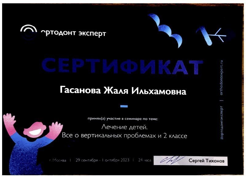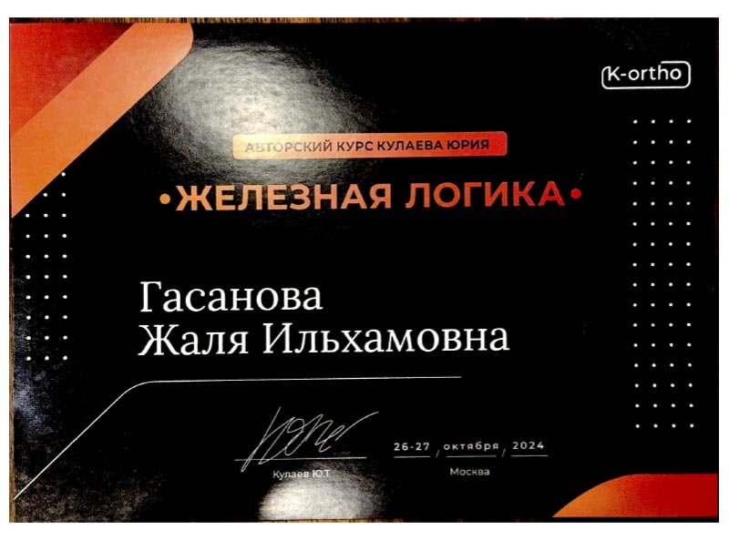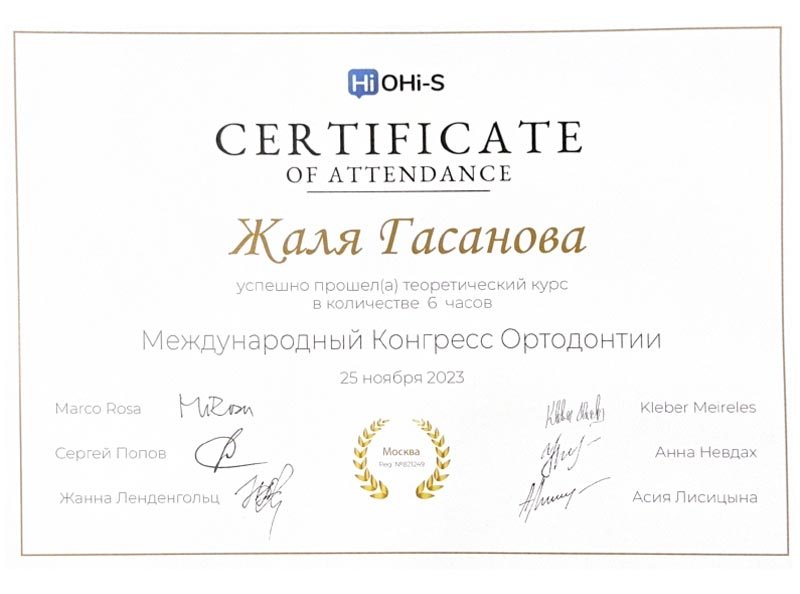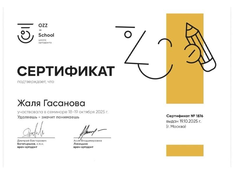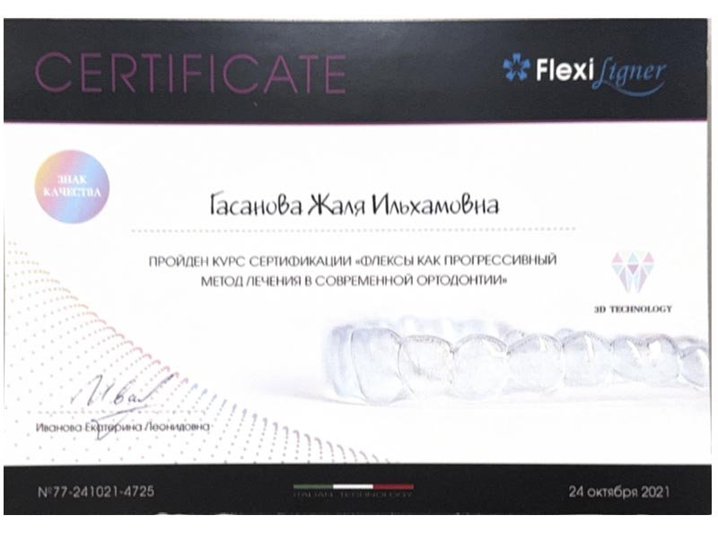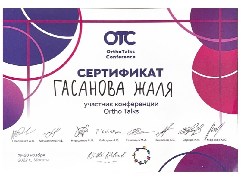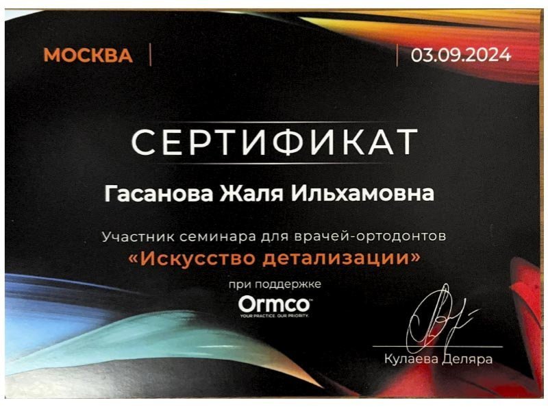 2021 г. – Московский государственный медико-стоматологический университет им. А.И.Евдокимова, первичная специализированная аккредитация по специальности «Ортодонтия»