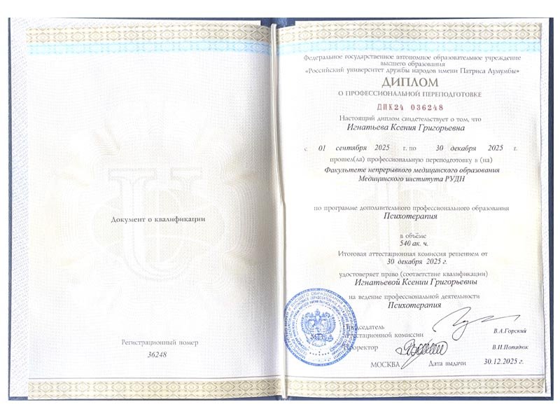 2024 г. – ФГБУ институт психиатрии и наркологии имени В.П.Сербского, ординатура по специальности «Сексология».