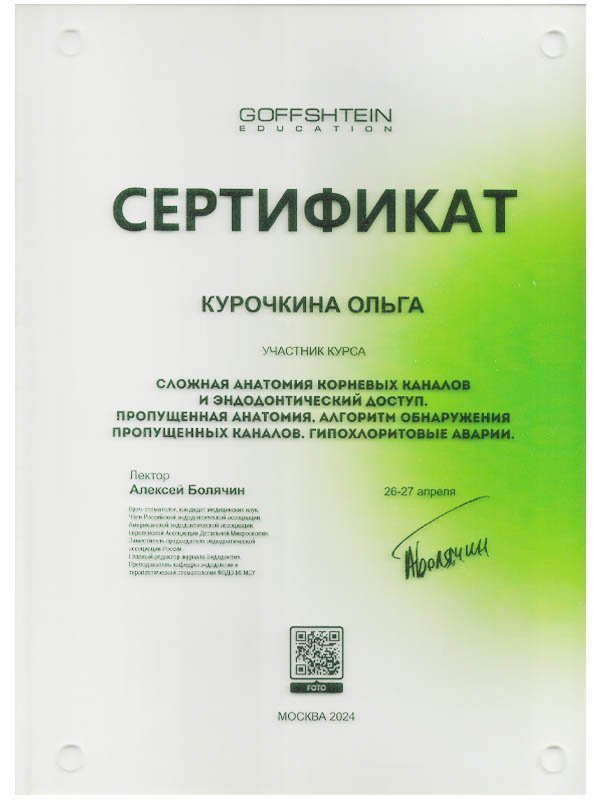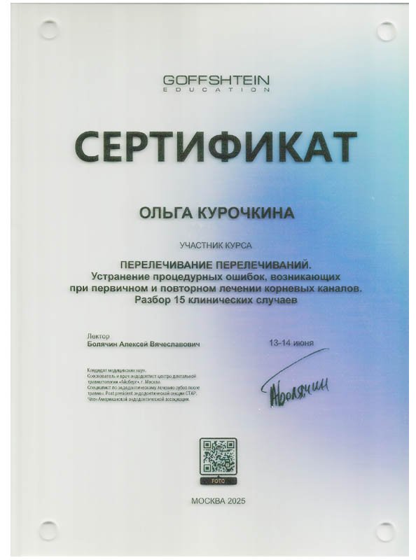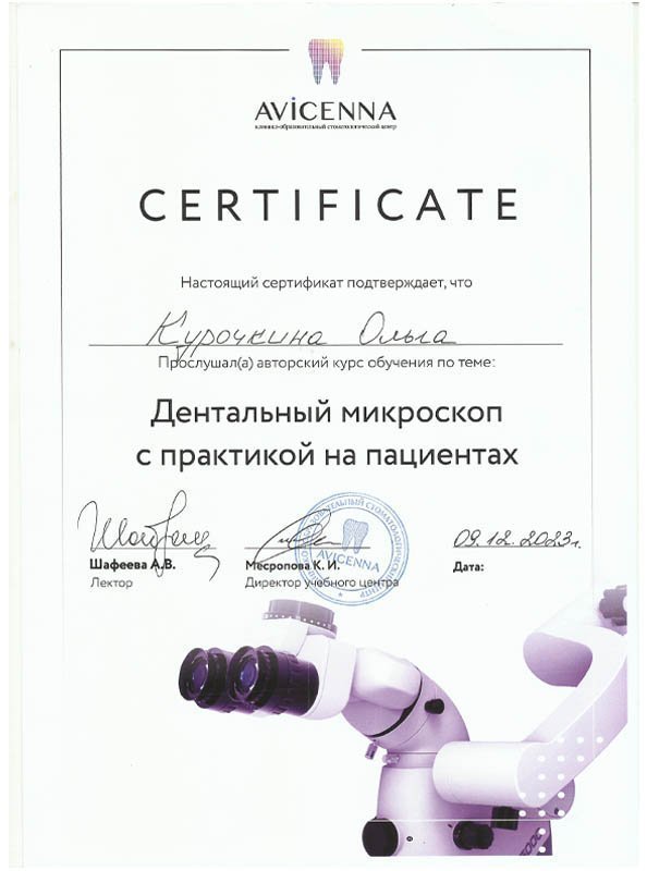 2016 г. – Сертификат специалиста по специальности «Стоматология общей практики».