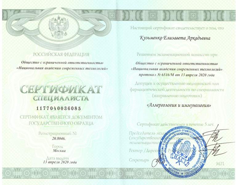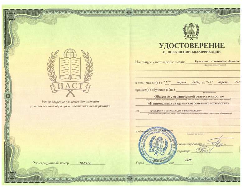 2015 г. - ординатура по специальности «Аллергология - иммунология», ФГБОУ ДПО «Институт повышения квалификации медико-биологического агентства», г. Москва