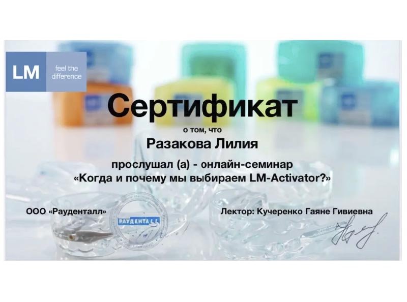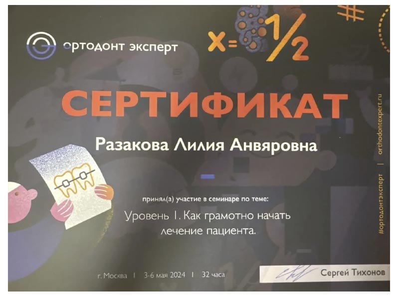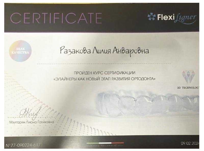 2023, 2024 г. – Повышение квалификации по программам: «Прогрессивное ортодонтическое лечение дистальной окклюзии с применением современной техники Aestelion», «Роль ортодонта в стоматологическом здоровье пациента Carrier», «Уровень 1. Как грамотно начать лечить пациентов Ортодонт Эксперт», «Сертификация от Flexiligner»