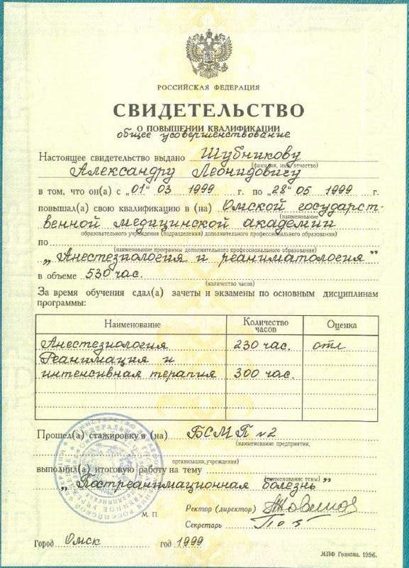 1987 г. - Специализация по специальности анестезиология и реаниматология на базе ОКБ, г. Омск
