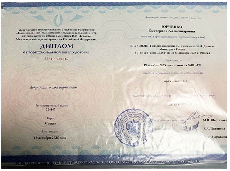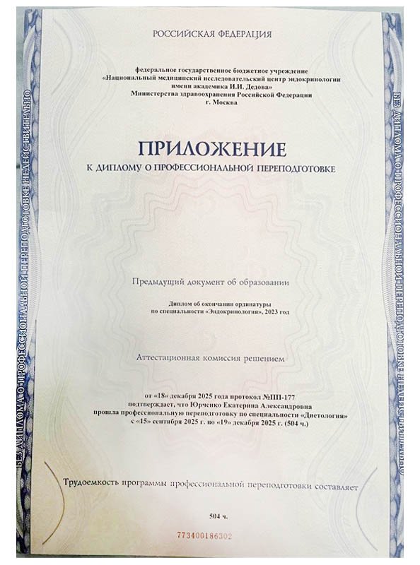 2023 г. – Московский областной научно-исследовательский клинический институт им. М.Ф. Владимирского (МОНИКИ), ординатура по специальности «Эндокринология».