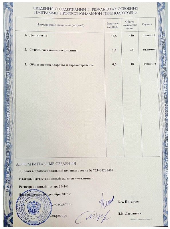 2021 г. – Первый Московский государственный медицинский университет им. И.М. Сеченова, диплом и первичная аккредитация по специальности «Лечебное дело».