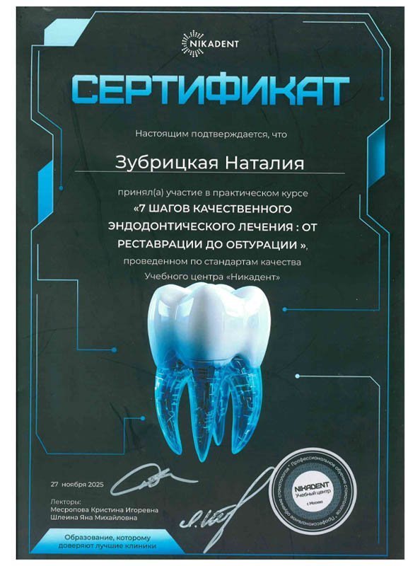 2005 г. – Учебный курс. Мастер- класс. « Американ Дентал Академи». «Секреты адгезивной стоматологии. Постэндодонтическая реабилитация зубов в функциональном и эстетическом аспектах.» Тверь. Григорьев А. В., руководитель уч. центра «Dental Academy»